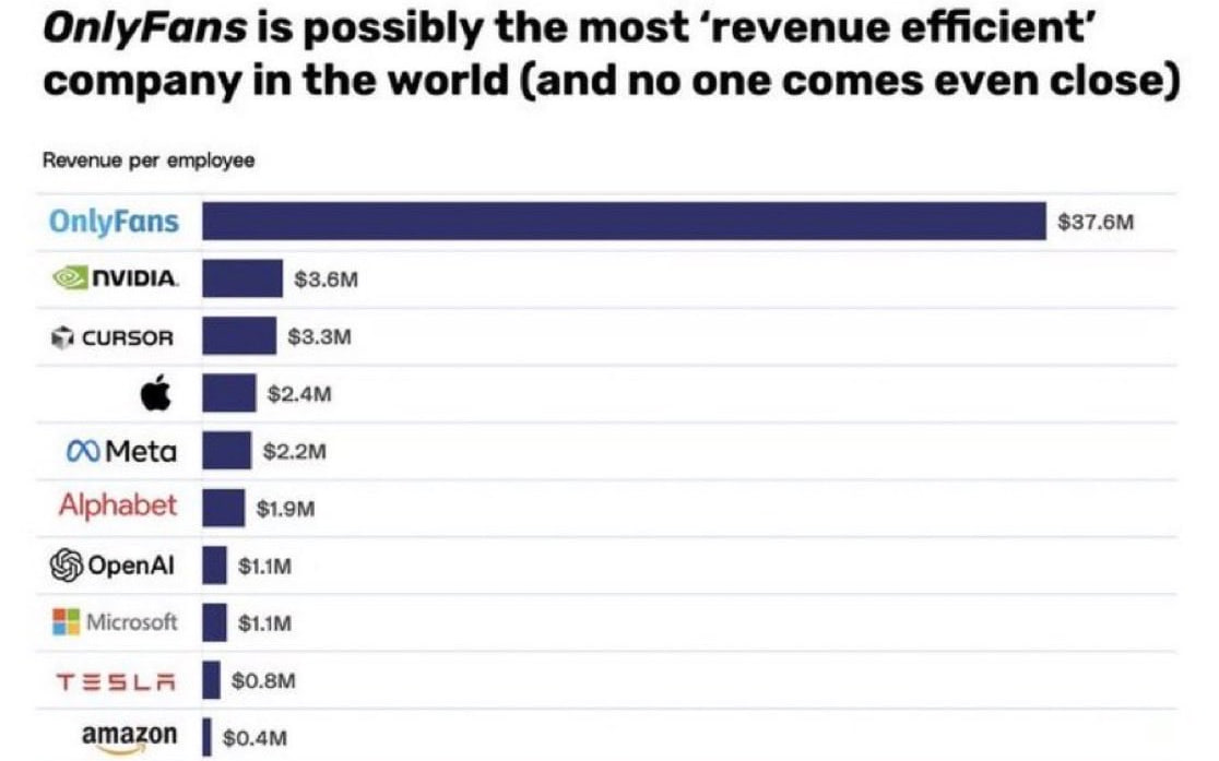 Финансово-маркетинговая компания Barchart сообщила, что платформа OnlyFans стала лидером в мире по прибыльности на одного сотрудника, каждый из которых в среднем принес компании $37,6 миллиона. Этот показатель значительно превышает результаты ведущих технологических компаний: NVIDIA — $3,6 миллиона, Apple — $2,4 миллиона, Meta — $2,2 миллиона, Google — $1,9 миллиона, OpenAI и Microsoft — около $1,1 миллиона на работника.