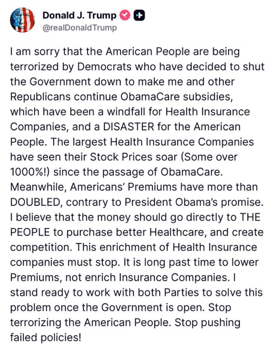 «Акции крупнейших страховых компаний выросли в цене (некоторые более чем на 1000%!) с момента принятия Obamacare. Между тем страховые взносы американцев более чем удвоились, вопреки обещаниям Обамы», — написал Трамп.
