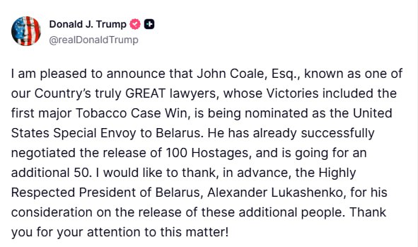 «Рад сообщить, что Джон Коул, один из действительно великих юристов нашей страны, известный своей победой в первом крупном деле против табачных компаний, выдвинут на должность специального посланника США в Беларуси», — говорится в публикации.