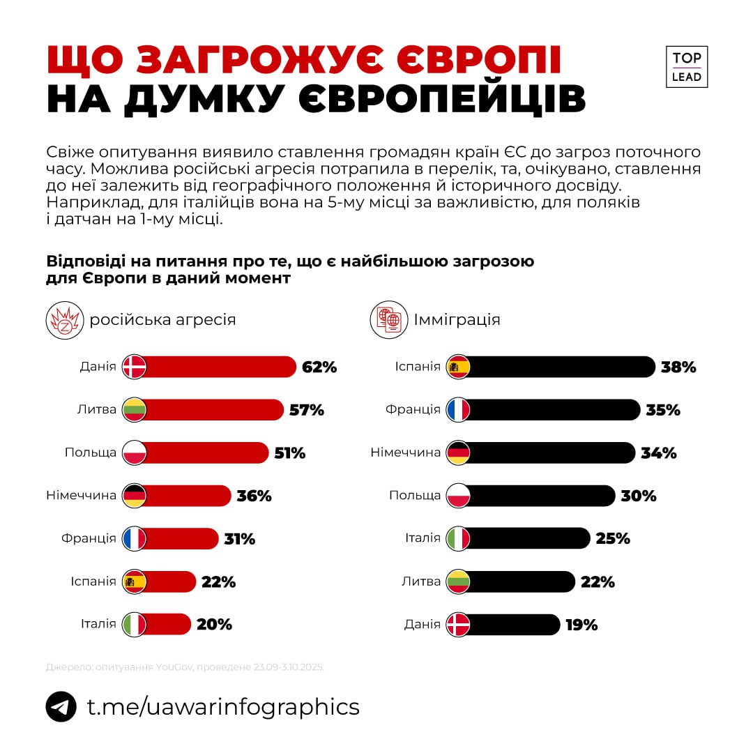 Согласно данным опроса YouGov, опубликованным на инфографике Top Lead, больше всего обеспокоены жители Дании — 62% опрошенных считают Россию серьезной угрозой для Европы. В Польше этого мнения придерживаются 51% респондентов, в Литве — 57%.
