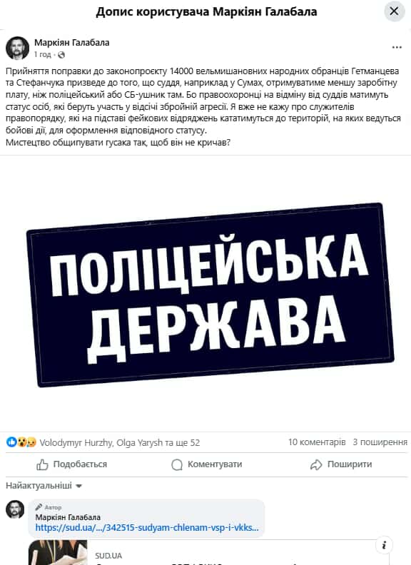 «Принятие поправки к законопроекту 14000 многоуважаемых народных избранников Гетманцева и Стефанчука приведет к тому, что судья, например, в Сумах, будет получать меньшую заработную плату, чем полицейский или СБ-шник там. Потому что правоохранители, в отличие от судей, будут иметь статус лиц, участвующих в отражении вооруженной агрессии. Я уже не говорю о служителях правопорядка, которые на основании фейковых командировок будут кататься на территории, где ведутся боевые действия, для оформления соответствующего статуса. Искусство ощипывать гуся так, чтобы он не кричал», – написал Маркиян Галабала в соцсетях, комментируя новость «Судебно-юридической газеты».