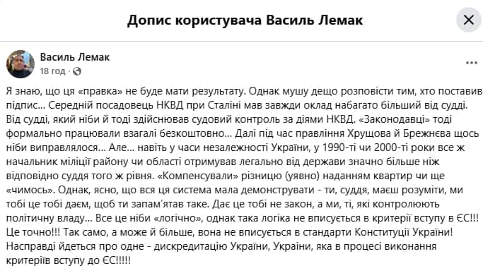 «Однако должен кое-что рассказать тем, кто поставил подпись... Средний чиновник НКВД при Сталине имел всегда оклад гораздо больший, чем у судьи. У судьи, который якобы и тогда осуществлял судебный контроль за действиями НКВД. «Законодатели» тогда формально работали вообще бесплатно... Далее во время правления Хрущева и Брежнева что-то будто исправлялось... Но... даже во времена независимости Украины, в 1990-е или 2000-е годы все же начальник милиции района или области получал легально от государства значительно больше, чем соответственно судья того же уровня. «Компенсировали» разницу (условно) предоставлением квартир или еще «чем-то». Однако, ясно, что вся эта система должна была демонстрировать – ты, судья, должен понимать, мы тебе это даем, чтобы ты запомнил такое. Дает это тебе не закон, а мы, те, которые контролируют политическую власть... Все это будто «логично», однако такая логика не вписывается в критерии вступления в ЕС!!! Это точно!!! Точно так же, а может и больше, она не вписывается в стандарты Конституции Украины! На самом деле речь идет об одном – дискредитации Украины, Украины, которая в процессе выполнения критериев вступления в ЕС!!!!!» – написал он.