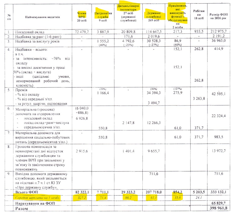 Как указано в таблице, средняя зарплата на одного члена ВСП составляет 327,2 тысячи грн. Общий фонд оплаты труда на 20 членов ВСП должен составлять 82,32 млн грн. То есть, 343 тысячи грн в месяц для одного члена Высшего совета правосудия, если разбить эту сумму на 12 месяцев.