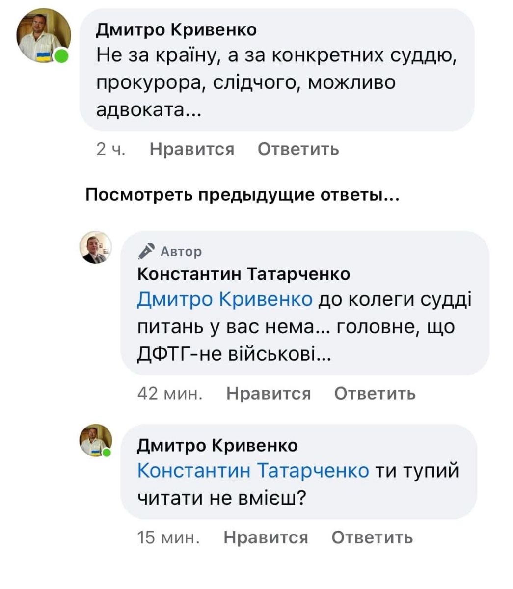 Кроме того, некоторые высказывания Дмитрия Кривенко можно расценивать как прямые угрозы и не способность судьи контролировать себя.