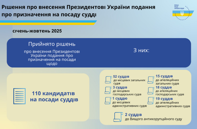 В течение января – октября 2025 года Высший совет правосудия принял решения о внесении Президенту Украины Владимиру Зеленскому представления о назначении 110 кандидатов на должности судей, из них:
