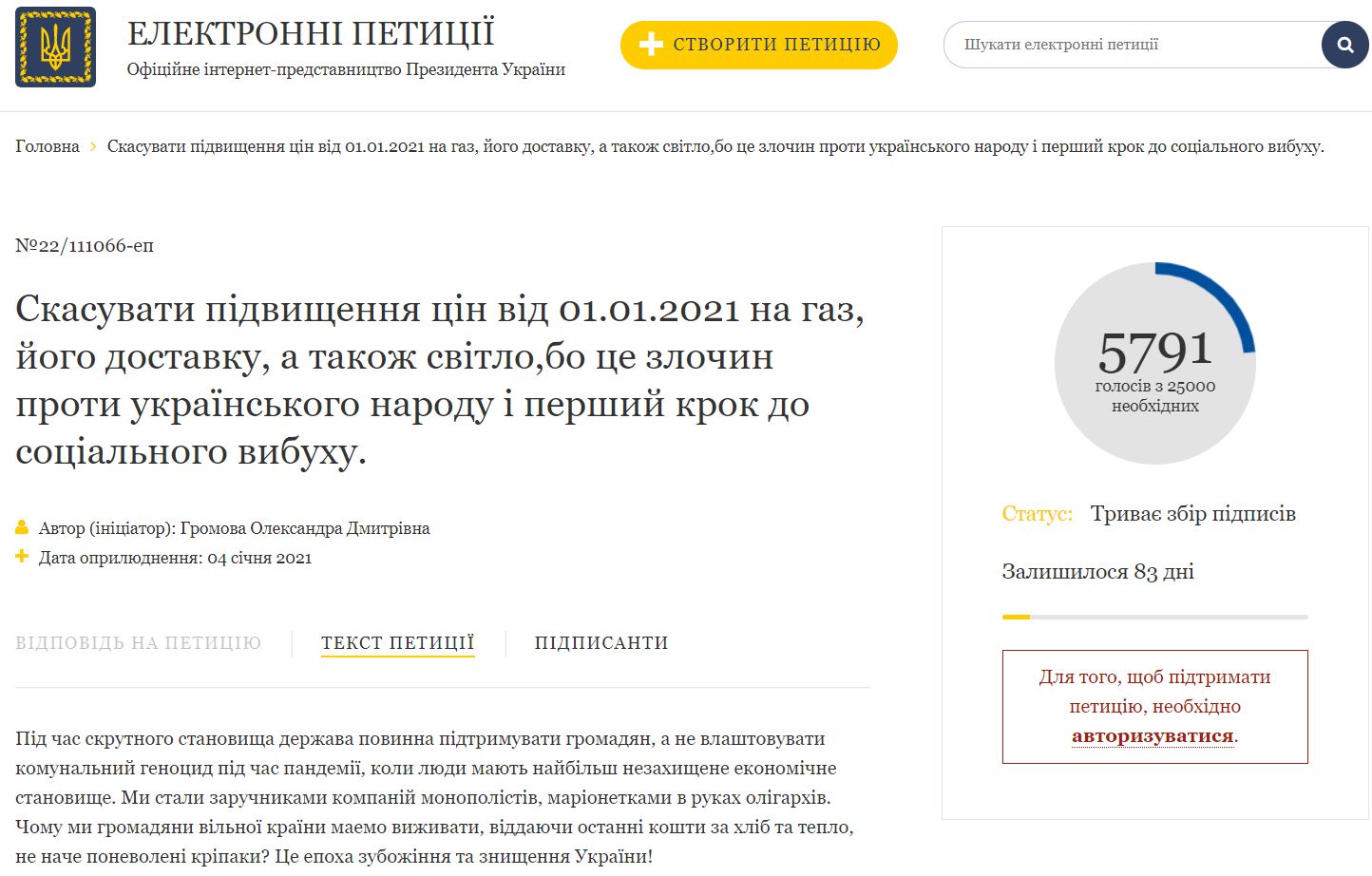 «Під час скрутного становища держава повинна підтримувати громадян, а не влаштовувати комунальний геноцид під час пандемії, коли люди мають найбільш незахищене економічне становище. Ми стали заручниками компаній монополістів, маріонетками в руках олігархів. Чому ми, громадяни вільної країни, маємо виживати, віддаючи останні кошти за хліб та тепло, неначе поневолені кріпаки? Це епоха зубожіння та знищення України!», — йдеться у тексті петиції.