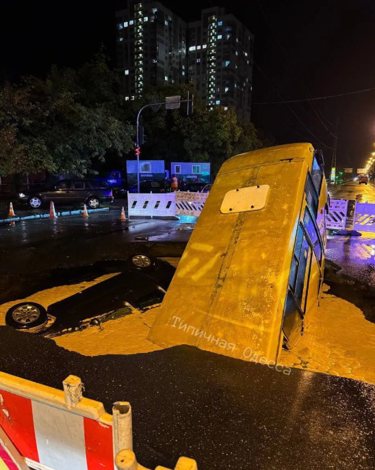 Кроме того, в результате ливня в Одессе сначала под воду, а затем и под асфальт ушли маршрутка и легковой автомобиль. Это произошло на месте, где проходит теплотрасса — из-за высоких температур маршрутка частично расплавилась.