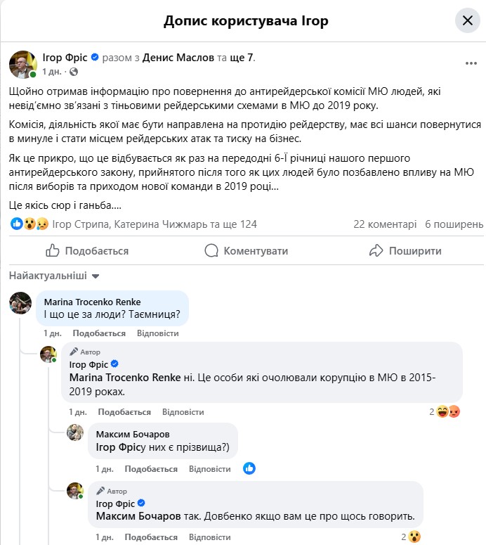 «Получил информацию о возвращении в антирейдерскую комиссию МЮ людей, которые неразрывно связаны с теневыми рейдерскими схемами в МЮ до 2019 года.