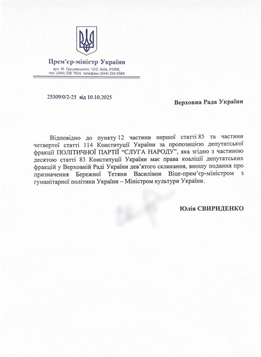 Председатель Верховной Рады Украины Руслан Стефанчук сообщил, что премьер-министр Юлия Свириденко подала предложение назначить Татьяну Бережную вице-премьер-министром по гуманитарной политике — министром культуры Украины.