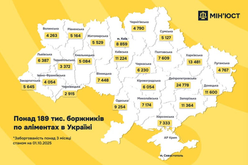 По данным Минюста, больше всего должников, которые более трех месяцев не платят алименты, зафиксировано в Днепропетровской области (16,2 тыс.), Харьковской (13,8), Донецкой (12,4), Запорожской (11,1) и Одесской (9,7). Меньше всего — в Черновицкой (0,7 тыс.), Тернопольской (0,9) и Луганской (0,5) областях.