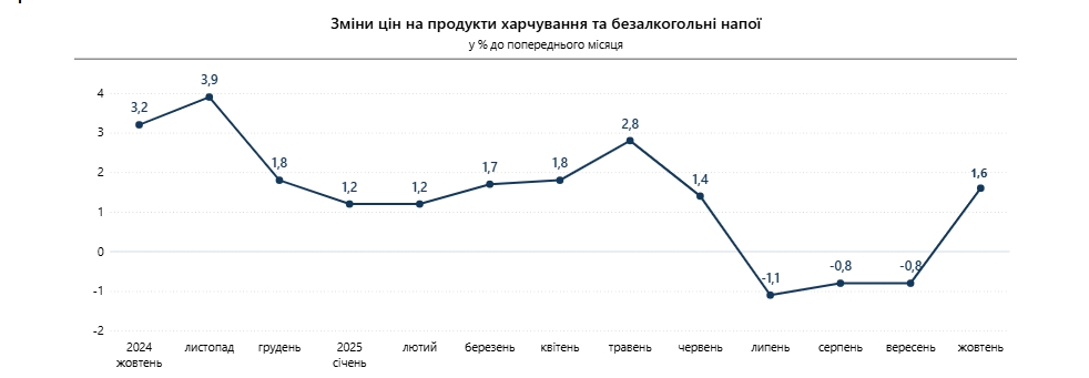 Так, в октябре по сравнению с сентябрем цены на продукты питания и безалкогольные напитки выросли на 1,6%. Больше всего (на 11% и 10,4%) подорожали яйца и овощи. На 1-7% выросли цены на сало, продукты переработки зерновых, масло подсолнечное, молоко, рыбу и продукты из рыбы, безалкогольные напитки, хлеб, масло, мясо и мясопродукты, сыры.