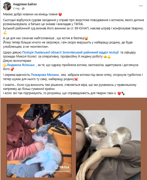 Буский районный суд Львовской области наложил штраф на родителей ребенка, который разрисовал кота фломастерами, и принял решение о конфискации животного. В комментарии «Суспільному» зоозащитница Адриана Байло рассказала, что отец ребенка явился на судебное заседание, признал свою вину и не планирует обжаловать решение. Суд признал мужчину виновным по статье 89 Кодекса Украины об административных правонарушениях, которая касается жестокого обращения с животными, назначил штраф и постановил конфисковать кота.