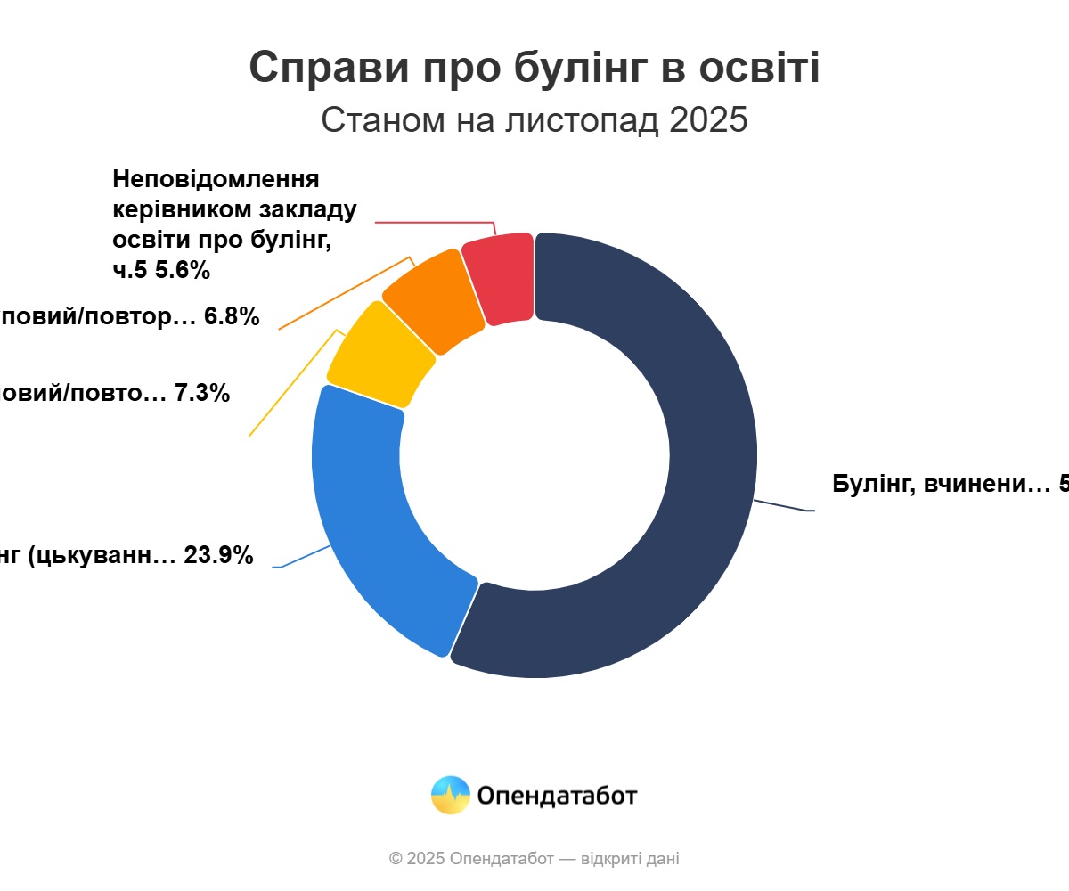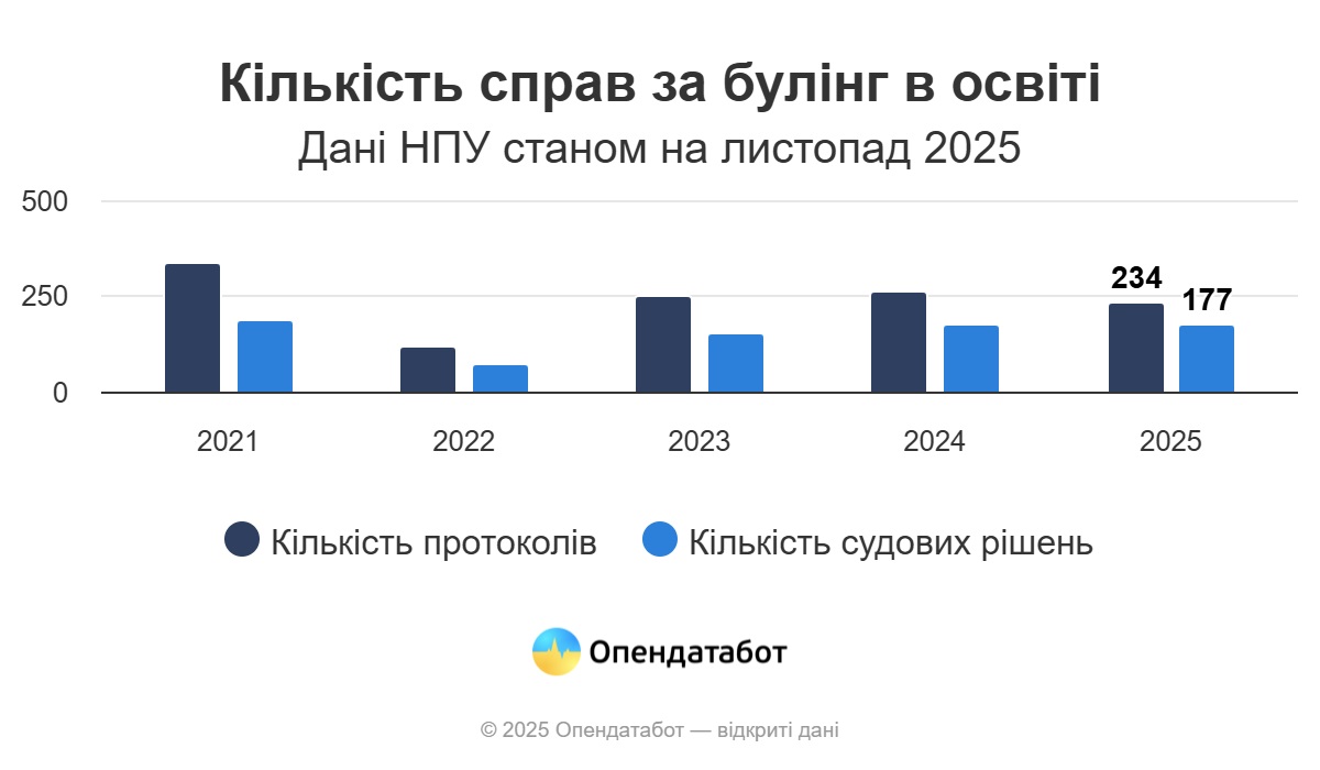 С начала 2025 года в Украине было составлено 234 административных протокола относительно буллинга в учебных заведениях, что на 7% больше, чем в прошлом году, когда таких дел зафиксировали 219, свидетельствуют данные Opendatabot.