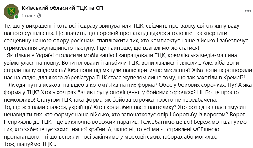 Киевский областной ТЦК опубликовал заявление, в котором назвал распространение подобных материалов элементом «вражеской пропаганды», направленной на подрыв доверия к тем, кто комплектует украинскую армию.