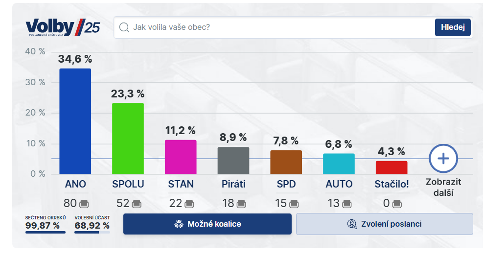 Як вказує IDNES, рух ANO Андрея Бабіша впевнено лідирує, маючи 34,6%. SPD на чолі з Томіо Окамурою — також долає 5% бар’єр і отримує 7,8%.
