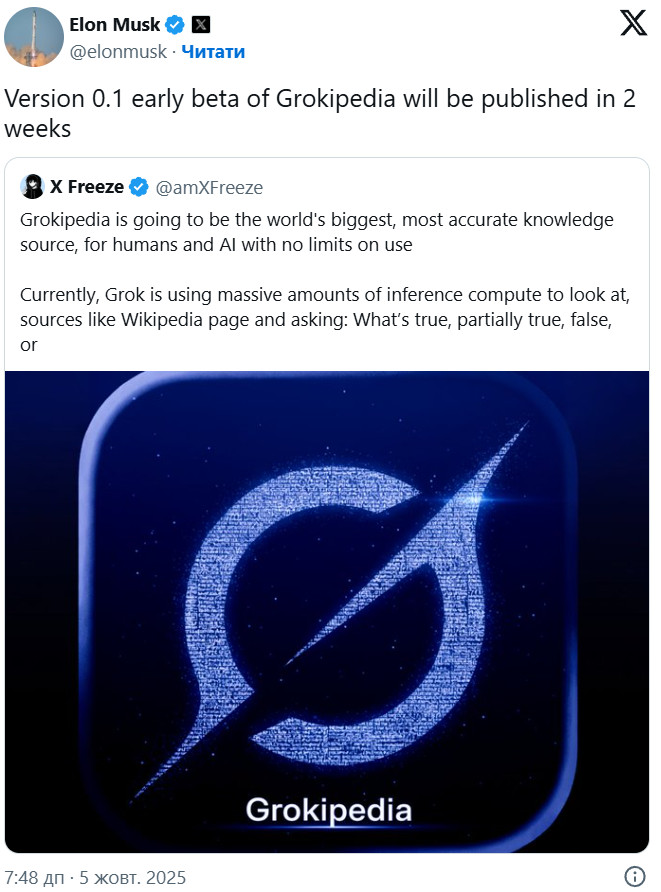 «Grokipedia стане найбільшою і найточнішою базою знань для людей та штучного інтелекту – без упереджень та прихованих мотивів», – йдеться у повідомленні.