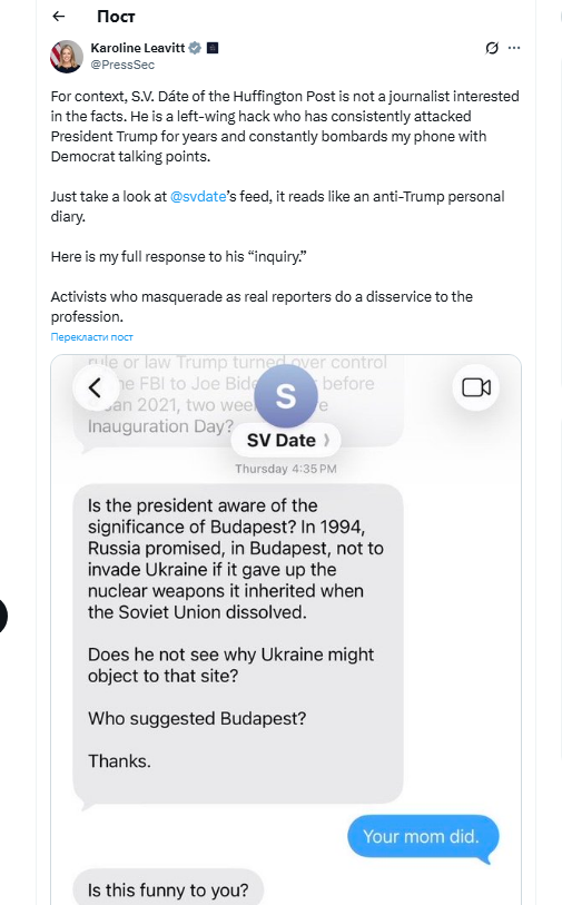 Після цього Лівітт опублікувала у своїх соцмережах знімок екрана повної переписки з журналістом HuffPost, підтвердивши, що саме ця фраза була її офіційною реакцією.