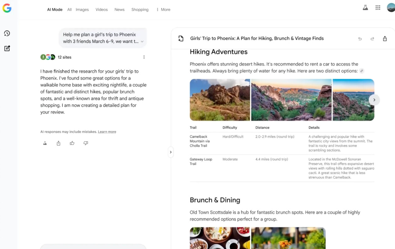 Користувачі Google тепер можуть описати свою майбутню подорож у AI Mode в пошуку та обрати опцію «Create with Canvas», яка сформує повний маршрут у боковій панелі — з даними про авіарейси та готелі. Створений документ міститиме можливі плани поїздки з пропозиціями, що базуються на введених користувачем даних, а також фото та відгуки з Google Maps, пише The Verge.