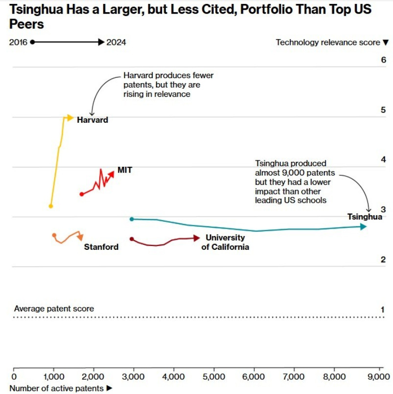 Bloomberg додає, що США все ще володіють найбільш впливовими патентами у сфері ШІ та найефективнішими моделями. Гарвард і МІТ стабільно випереджають Цінхуа за впливовістю своїх патентів. Американські університети також розробляють більше значущих моделей ШІ, ніж китайські — 40 проти 15 у 2024 році. Однак китайські університети скорочують розрив за деякими показниками ефективності.