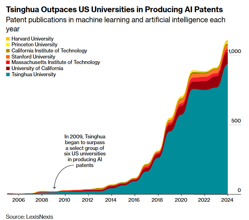 Як зазначає агентство, професори та студенти Університету Цінхуа накопичують величезну кількість інтелектуальної власності. З 2005 по 2024 роки Університет Цінхуа отримав майже 5 тис. патентів у сфері ШІ та машинного навчання, 900 з них — за минулий рік. Загалом на Китай зараз припадає більше половини всіх активних патентних сімейств у цих галузях.