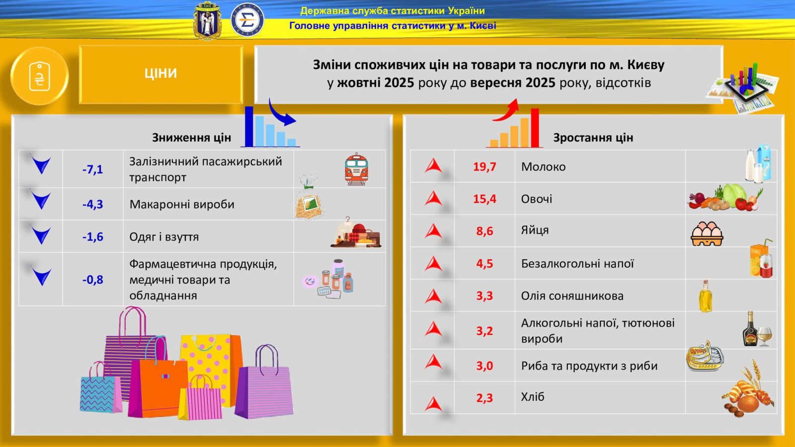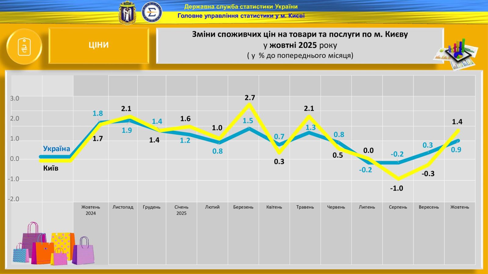 Головне управління статистики у м. Києві оприлюднило дані щодо індексу споживчих цін за жовтень 2025 року. За місяць ціни в столиці зросли на 1,4%, що вище, ніж у середньому по Україні (0,9%). Із початку року інфляція в Києві сягнула 8,6%.