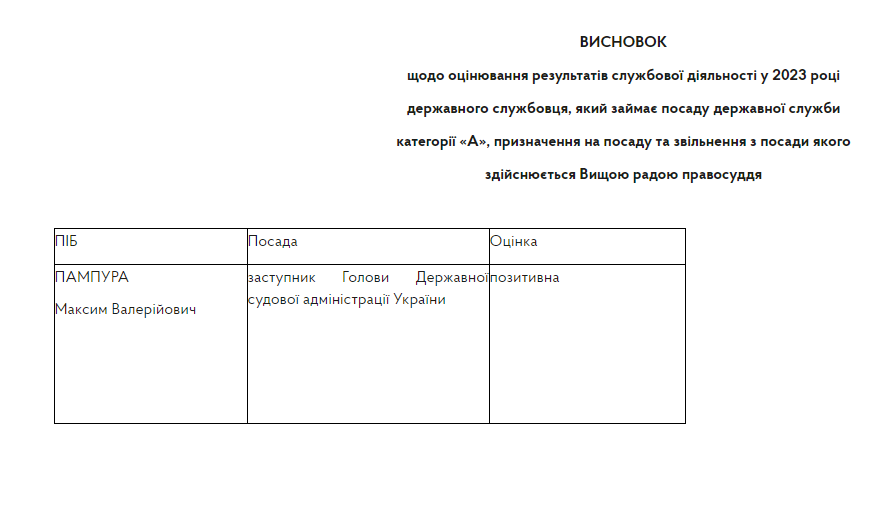Вища рада правосуддя 8 лютого 2024 року затвердила висновок щодо оцінювання результатів службової діяльності в. о. голови ДСА Максима Пампури у 2023 році.