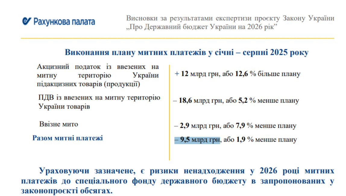 Так, вона зазначила, «стан виконання у січні – серпні 2025 року планових показників надходження митних платежів до загального фонду державного бюджету збільшує ризик їх невиконання у 2025 році і посилює його на 2026 рік».