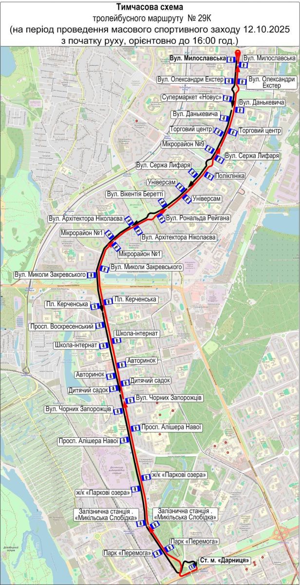 - Тролейбус № 29-К курсуватиме від ст. м. «Дарниця» до вул. Милославської (за маршрутом тролейбуса № 50-К).