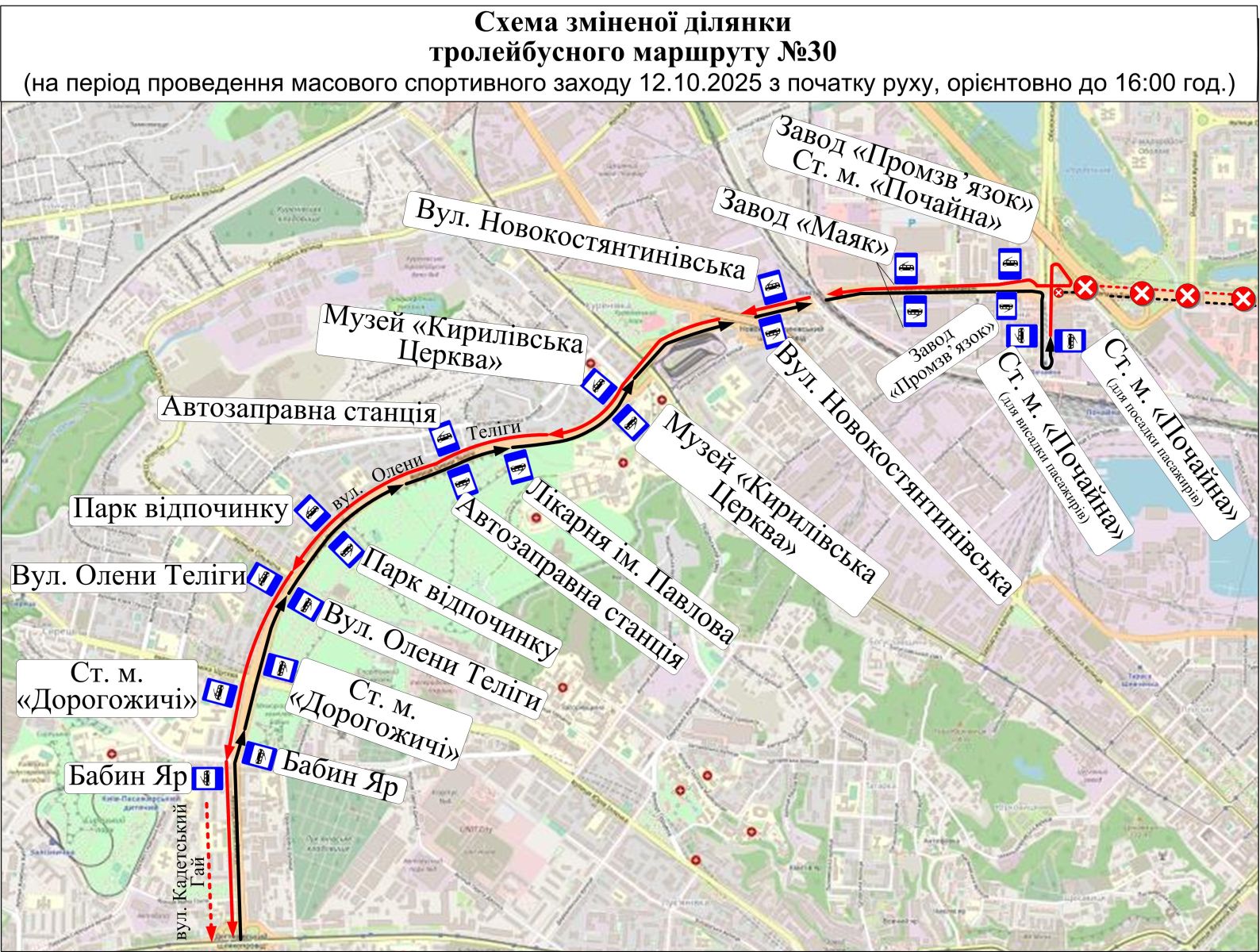 - Тролейбус № 30 — від вул. Кадетський Гай до ст. м. «Почайна».