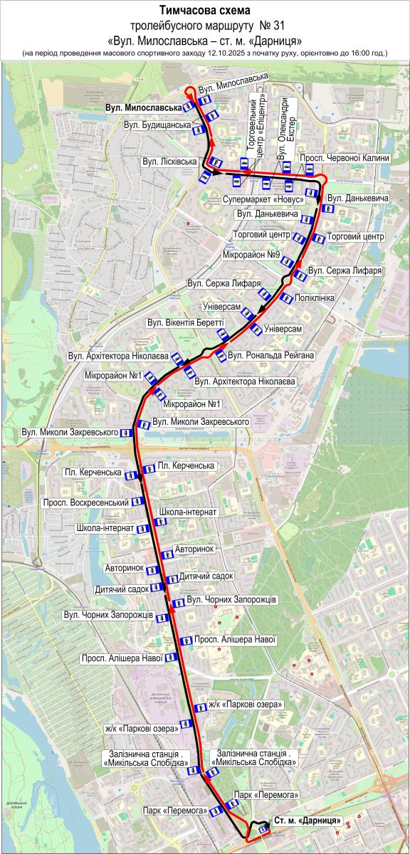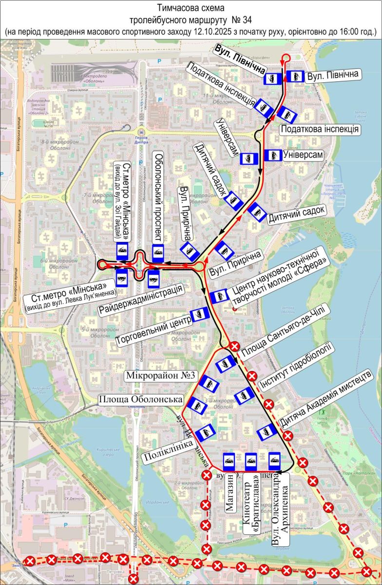 - Тимчасова схема маршруту тролейбуса № 34 — від вул. Північної до вул. Олександра Архипенка.