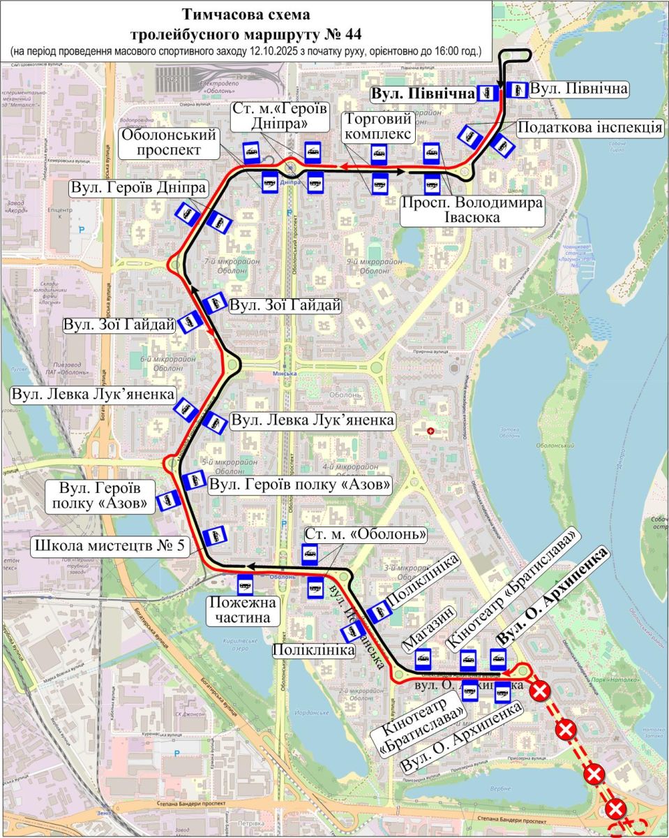 - Тимчасова схема маршруту тролейбуса № 44 — від вул. Північної до вул. Олександра Архипенка.