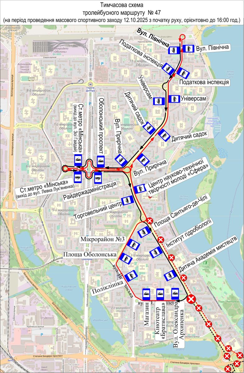 - Тимчасова схема маршруту тролейбуса № 47 — від вул. Північної до вул. Олександра Архипенка.