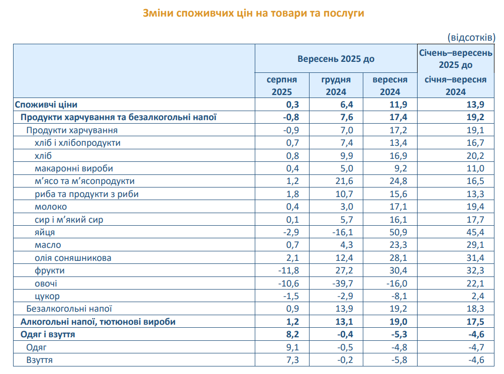 У вересні 2025 року споживчі ціни в Україні зросли на 0,3% порівняно з серпнем, тоді як у річному вимірі інфляція становила 11,9%. Про це свідчать дані Державної служби статистики України.