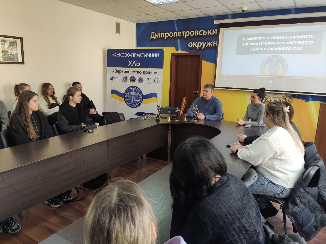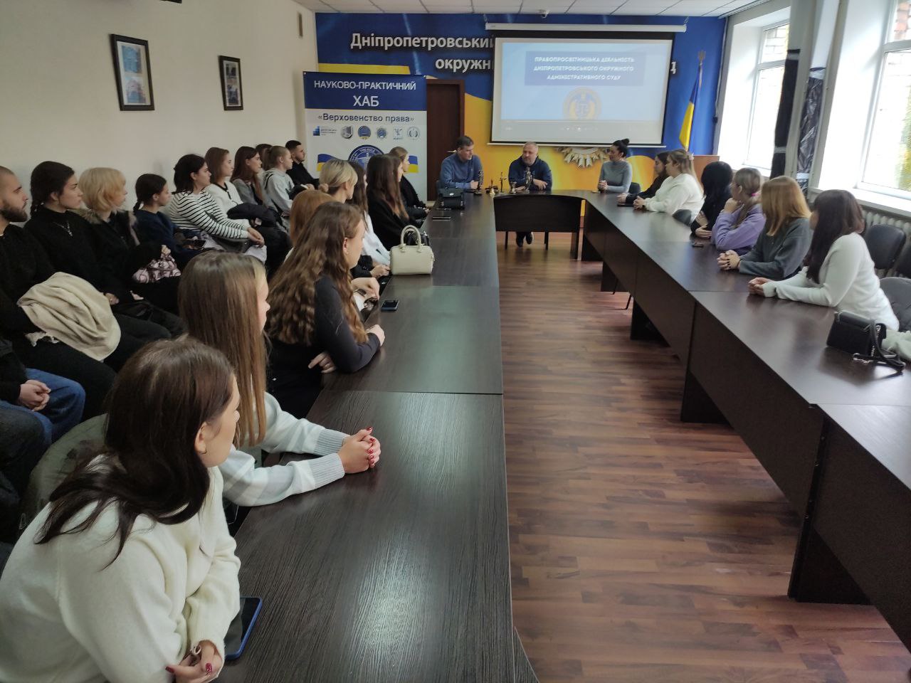У Дніпропетровському окружному адміністративному суді в межах діяльності науково-практичного хабу «Верховенство права» відбувся День відкритих дверей для студентів другого курсу юридичного факультету Дніпровського державного університету внутрішніх справ з метою ознайомлення молоді з функціонуванням адміністративного суду, особливостями судового процесу та роллю судової влади у забезпеченні верховенства права.