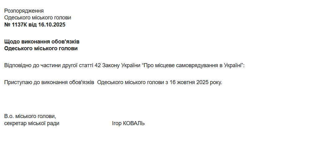 Обов’язки мера Одеси перейшли до секретаря міськради Ігоря Коваля.