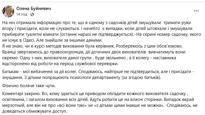 За інформацією, яка надійшла їй, в дитсадку дітей примушували тримати руки вгору, присідати, а також, за непідтвердженими даними, штовхали та змушували прибирати туалетні кімнати. За словами Буйневич, хоча в повідомленні вказали номер дитсадка, якого не існує в Одесі, заклад вдалося ідентифікувати за іншими даними.