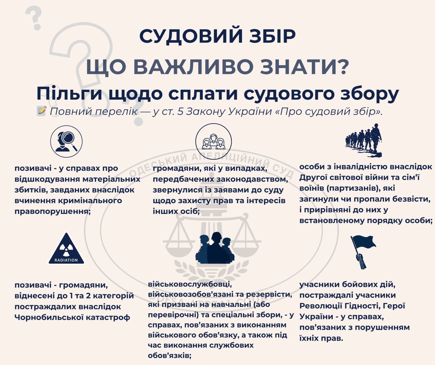 Закон передбачає низку випадків, коли громадяни звільняються від сплати судового збору. Повний перелік пільг міститься у статті 5 Закону України «Про судовий збір». Серед тих, хто має право на звільнення: