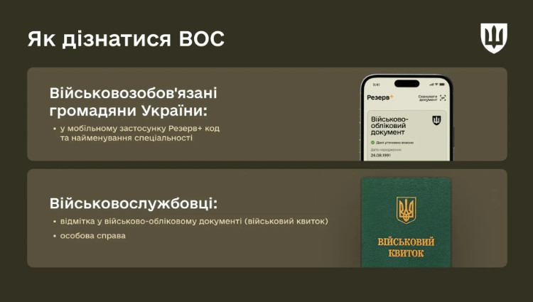 Військовозобов'язаний громадянин України може перевірити військово-облікову спеціальність у мобільному застосунку «Резерв+». У військовослужбовців відмітка про ВОС ставиться у військово-обліковому документі та заноситься до особової справи.
