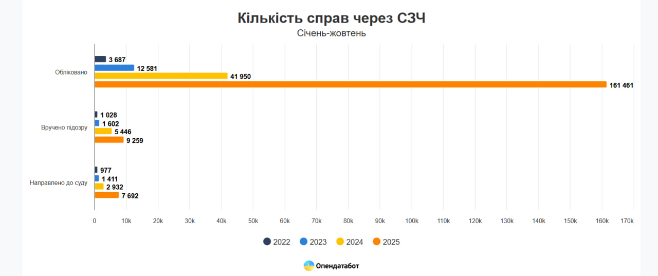 Так, цьогоріч кількість проваджень за СЗЧ різко зросла: якщо у 2024 році щомісяця реєстрували близько 5 тисяч справ, у 2023-му — 1,5 тисячі, а у 2022 році за весь рік було лише 6 тисяч, то у 2025-му аналогічна кількість справ накопичується менш ніж за два тижні.