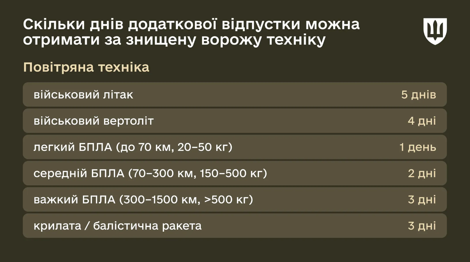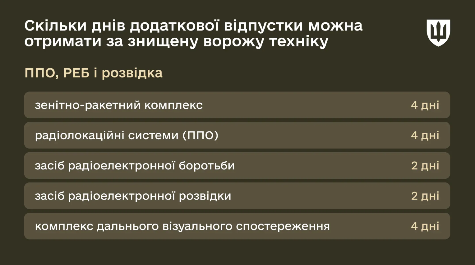 Військовим надаються додаткові дні відпустки залежно від типу знищеної техніки.